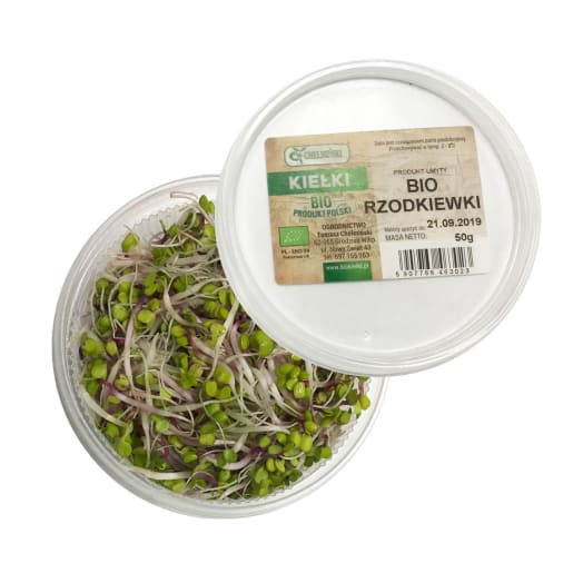 Kiełki rzodkiewki BIO zawierają sporo witaminy C. Są cennym źródłem jodu,potasu oraz magnezu,zawierają również siarkę dzięki czemu mają korzystny wpływ na skórę,włosy i paznokcie. Są pikantne w smaku, doskonałe do sałatek,kanapek i twarogu.