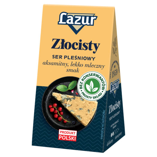 Ser pleśniowy Lazur Złocisty to klinek z fermentowanego mleka krowiego, który poprzerastany jest szlachetną odmianą pleśni. Ma mleczny, delikatny smak z aksamitną nutą. Doskonale komponuje się z warzywami, owocami, można nim także doprawić sos do makaronu lub zapiec na kanapce. Pasuje do czerwonego wina.