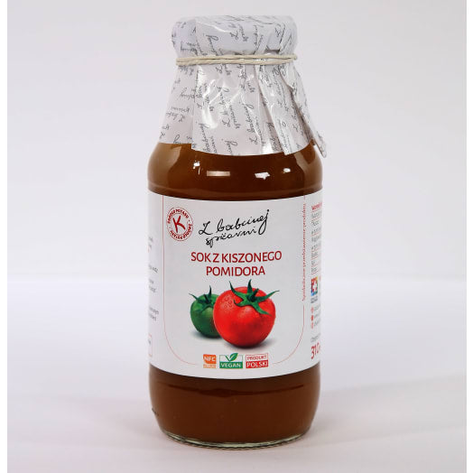 Sok z kiszonych pomidorów sporządzony z kiszonych pomidorów czerwonych oraz zielonych z dodatkiem naturalnych przypraw, w szklanej butelce hermetycznie zamkniętej utrwalony w procesie pasteryzacji. Wyprodukowany na bazie własnego ujęcia wody.